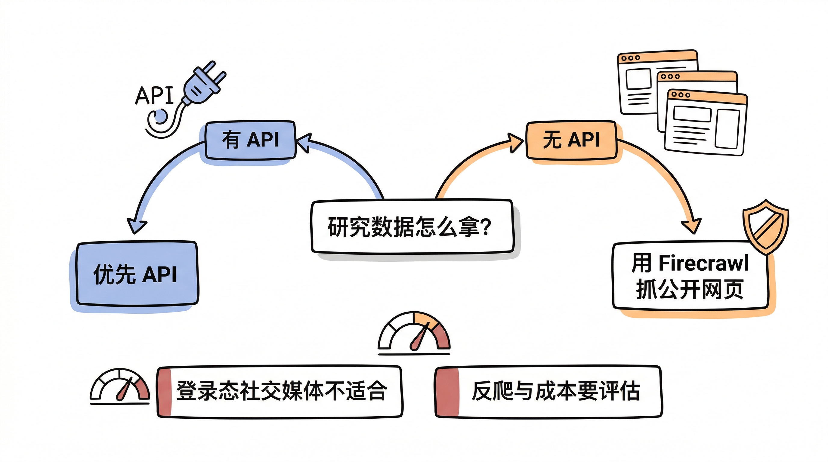 对这篇文章来说,这个提醒甚至比“怎么接进去”更关键。因为真正成熟的工作流,不是谁都用同一把锤子,而是先判断场景,再决定该用 API、Firecrawl,还是别的抓取工具。