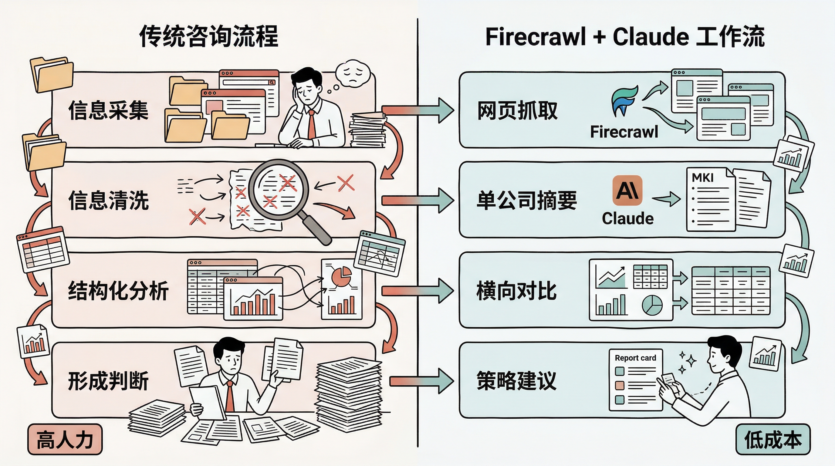 Firecrawl + Claude 替代的不是整个咨询公司,而是传统咨询项目里最标准化、最容易复制、也最贵的那一段基础研究流程。
