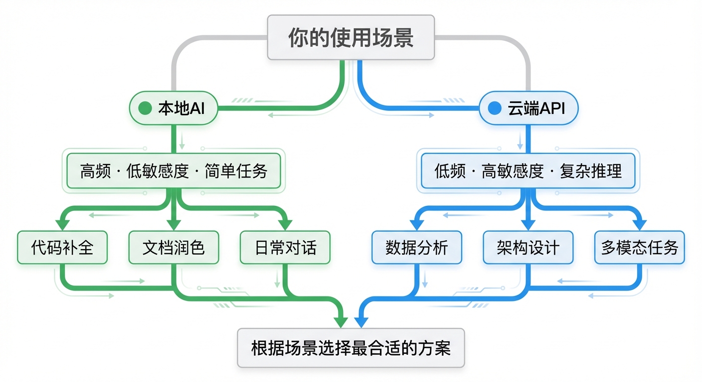 • 高频 · 低敏感度 · 简单任务 → 本地AI(代码补全、文档润色、日常对话)