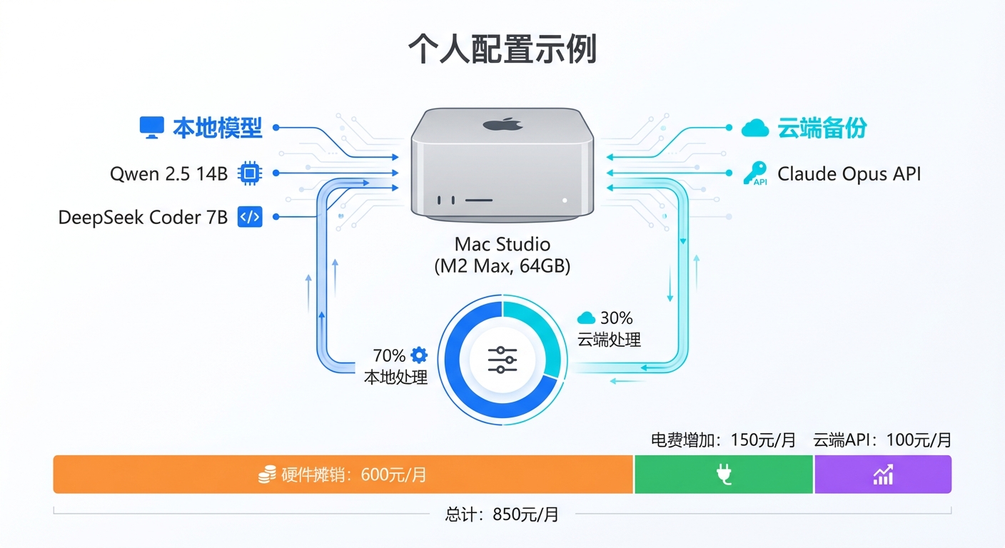 • 低频 · 高敏感度 · 复杂推理 → 云端API(数据分析、架构设计、多模态任务)